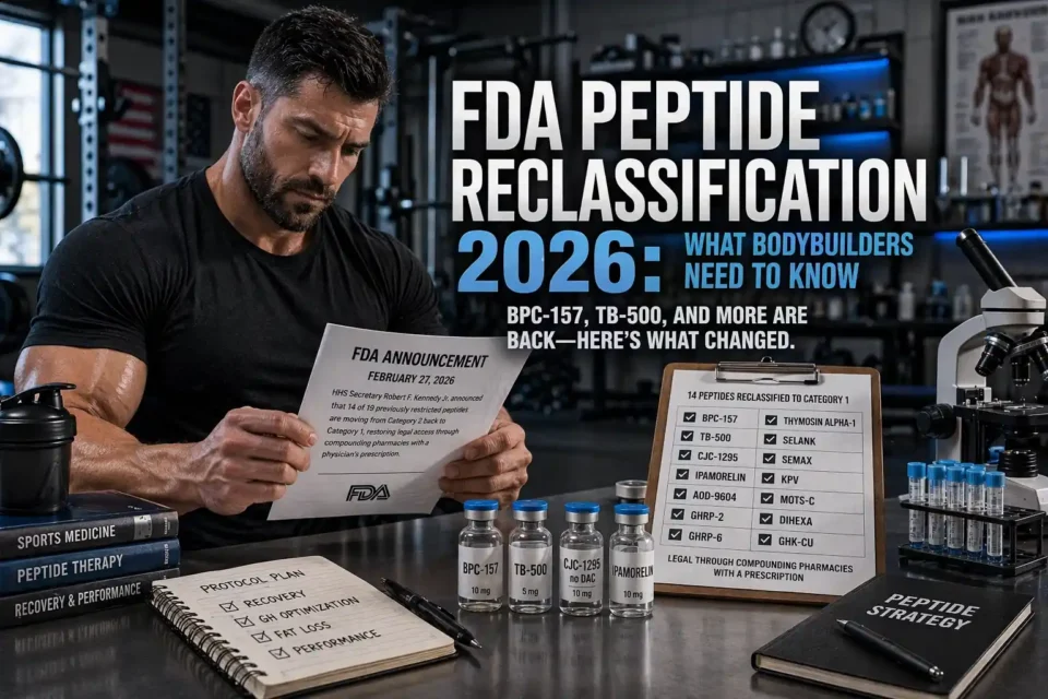 The FDA peptide reclassification 2026 moves 14 previously restricted peptides, including BPC-157, TB-500, CJC-1295, Ipamorelin, and AOD-9604, from Category 2 (restricted) back to Category 1 (available through compounding pharmacies with a prescription). This means bodybuilders can legally obtain pharmaceutical-grade versions of these compounds through a licensed provider instead of relying on unregulated research chemical vendors. The reclassification was announced on February 27, 2026 by HHS Secretary Kennedy, though formal FDA implementation is still in progress.